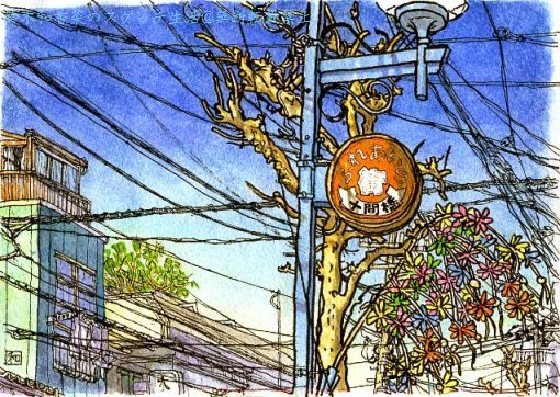 三鷹の行列のできる鯛焼き店「たかね」の絵。 味はまあ普通なのですが、他にも麩饅頭やいちご大福等 買えるし、店中でも色々選べるお茶と一緒に頂けます。 (素材の生産者さん達とかなり深く関わっているよう) 材料の全てが保存料無添加、そして店内には ヨーガンレールのふきんやシャンプーが置いてある、 そんなこだわりのお店です。 お店の前にはご覧のとおり、(使っていない)赤電話や ミシュランの(壊れた)フィギア、Tシャツや帽子、 鉢植え、それにこの店をバスの停留所に見立てた 標識まであって中々楽しい雰囲気です。