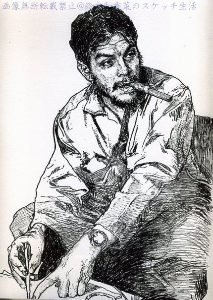 キューバ革命で有名なエルネスト・“チェ”・ゲバラです。 よくTシャツの柄になっている人です。 堅苦しかった…先日発掘しました。 顔や手に比べて体(画面下半分)の描写がぞんざいなのは もう嫌になったから!「ポートレイト」なのに なんで不鮮明な体(服)の陰影を想像しながら 細かく描かなくてはならない?顔が分かればいいじゃん! と挫折して、それっきり。 葉巻がでかい!ジャングルでの蚊取り線香代わりと キューバ産の葉巻の宣伝を兼ねてフカしていたそうです。