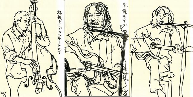 絵は、一番初めに描いた右の絵がある意味いいかも。 右・真ん中は朴保さん、左はバンドメンバーの方。 |