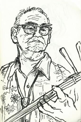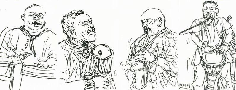 恵比寿のライブハウス「art cafe Friends」にて N先生のアフリカ・イタリアでのスケッチを展示中なのですけど 本日N先生とアフリカのミュージシャンのお二人を迎えて ライブ・ワインパーティーがありました。 演奏している様子をスケッチ出来たらいいな・・・と 思ったらすっかりスケッチ会と言う事になっていました。 絵は二人の演奏家を描いたスケッチです。 (マイブックより構成) 絶えず動いているのにF6?位の水彩紙にちゃんと描いて 色まで塗りかけた先生は相変わらずです。 やはり動いているものが好きなんですね。 展示は今月27日まで。但し今までの展覧会に 出品されて見たことある絵が多いかも。 |