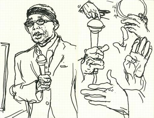 昨日の4/11(金)に新宿ジュンク堂書店で行われた、 『永沢まことの花スケッチレッスン』(小学館)刊行記念の 永沢まこと トーク&サイン会に行ってまいりました。 先生と参加なさった方々、どうもお疲れ様でした!! なんだか会場の8割位が記憶にある顔だったような(笑) 久々にお会いできた方、なんとこのブログを見てくださった方もおられて ありがたやありがたや・・・・・ トークショーではいつもながら真摯に暖かい絵のお話の数々でした。 今まで先生の本等で伺っていた内容だったと思います。 ふと微笑んでしまったのは、先生がご自身の事を 『自分くらいあらゆるものを描いた者はいないし、 世界中のあらゆる場所をまわって、描きまくった者はいない』 と評された(大体こんな内容だった)時でしょうか。自負されておられるのですね。 でもまったくそのとおりだと思います。 会場に飾ってある山吹の花をモチーフに、先生がその場でスケッチの実演 (凄くでっかく描いておられた)をなさったりもありました。 その後のサイン会は時間がかかりそうで、 夕食をとりたかったのと土日はスケッチでまたこの辺(新宿御苑)に 千葉から来ないと行けないので、失礼してしまいました。 アップした画像は、左側がトークショー中の先生をマイブックにスケッチしたものと 右側が、先生の、世界中を旅して沢山のスケッチを生み出してきた“手”のスケッチです。 |