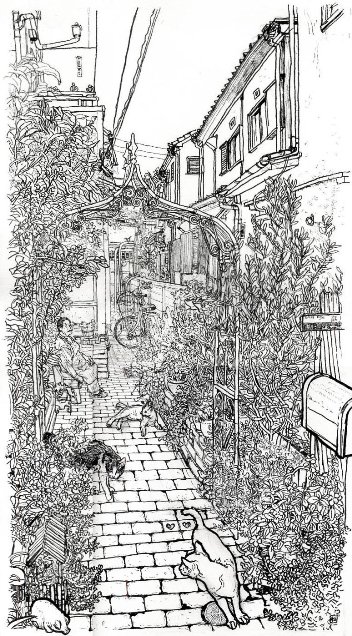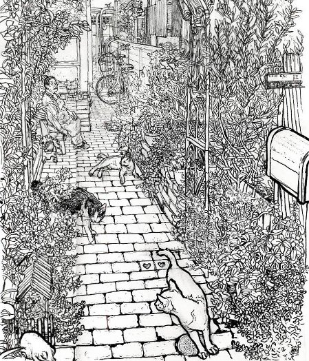 あるお宅の玄関先です。 (右手の庭、猫3匹、依頼主様のご家族込みで) 依頼人様よりOKが出たので、色塗り開始です。 前回は全体像を入れましたが、描いている本人も 気持ち悪くなるくらい細かくなってしまったので 一部画像でご紹介です。